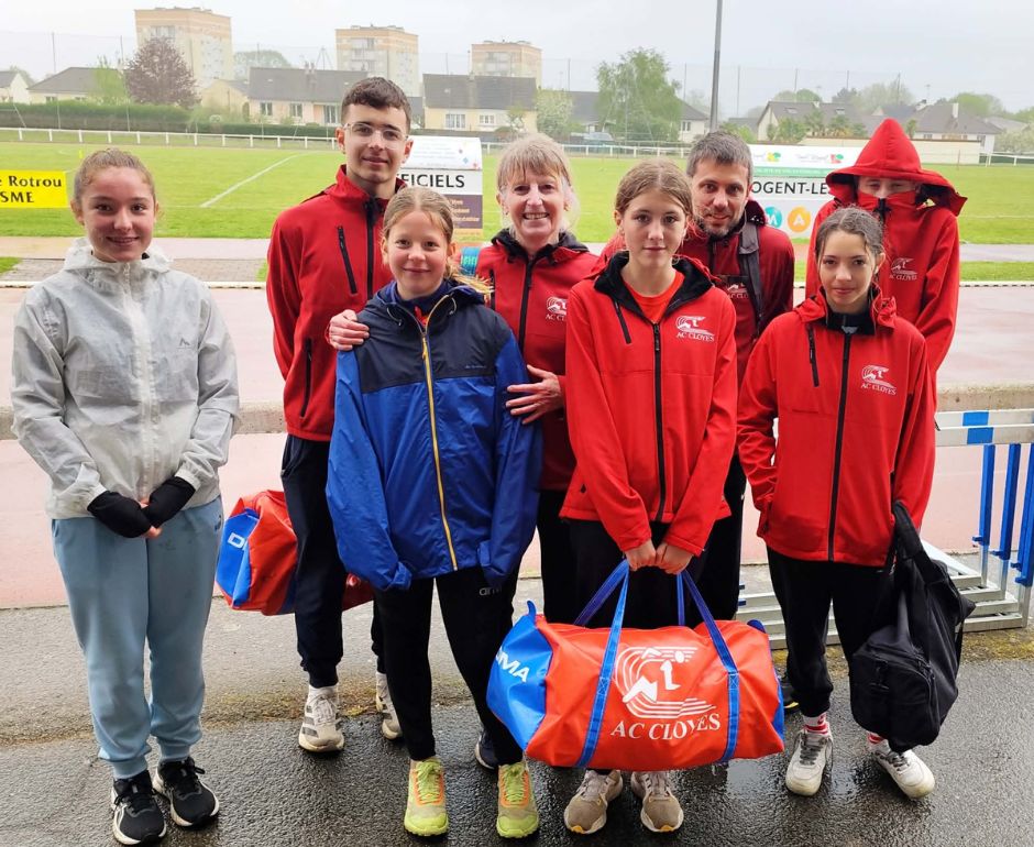C'est dans des conditions compliquées que les jeunes ont pu participer au meeting de Nogent le Rotrou, avec de la pluie sur les 3/4 de la compétition et des températures en baisse durant toute la journée ! La piste, très glissante sur les aires de sauts, n'a pas facilité l'accès aux performances.