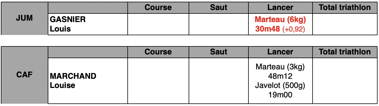 Félicitations à tous pour ces bons résultats confirmant la progression pour tous, malgrès des conditions pas simple pour s'entrainer aux lancers avec la fin des travaux de la piste !