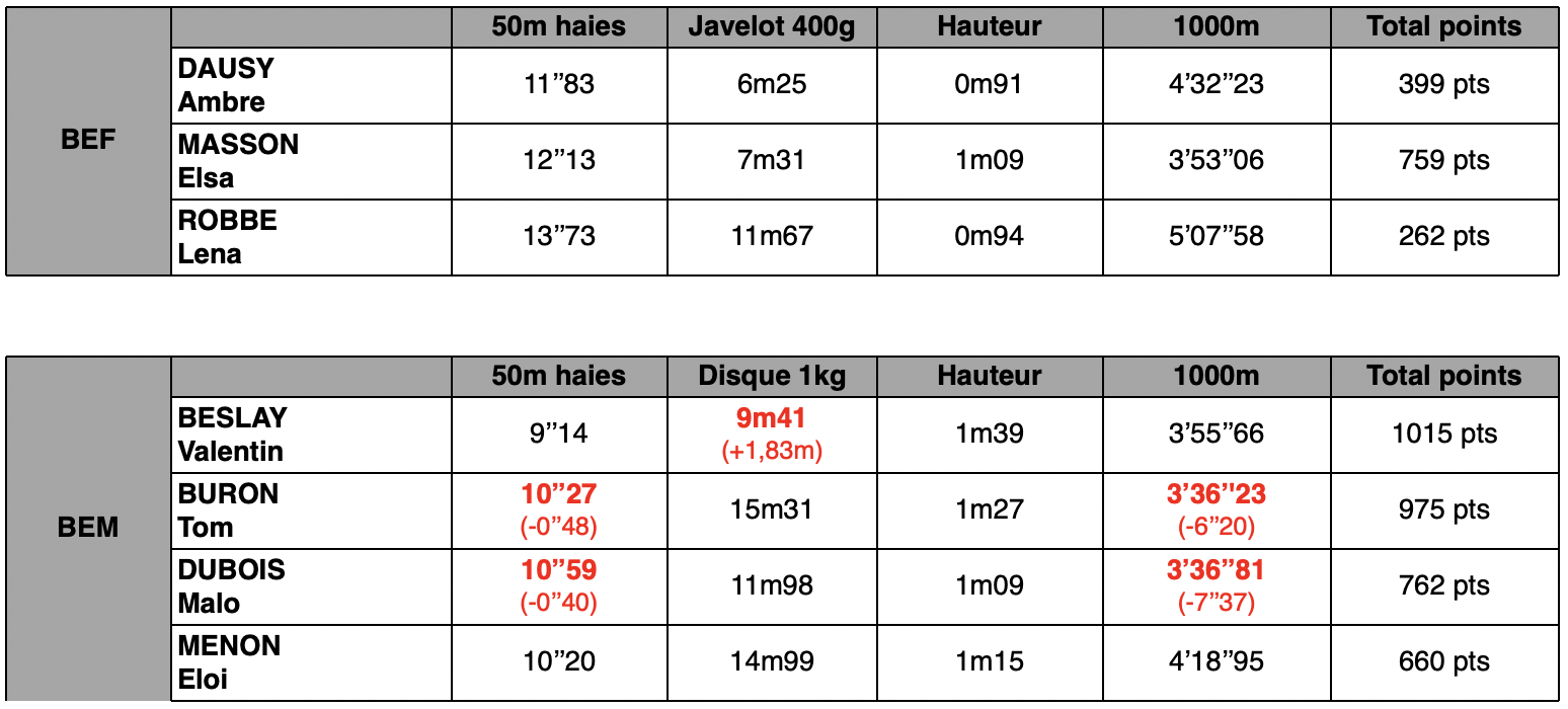 Chez les Benjamines 3 participantes, et chez les Benjamins 4 participants ; voici leurs performances :